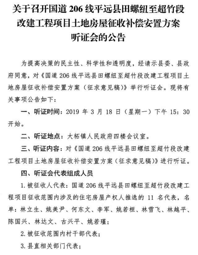 關于召開國道206線平遠縣田螺紐至超竹段改建工程項目土地房屋征收補償安置方案聽證會的公告