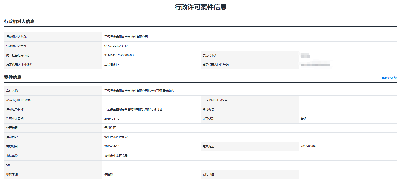 關于平遠縣金鑫耐磨合金材料有限公司排污許可證重新申請的辦結公告