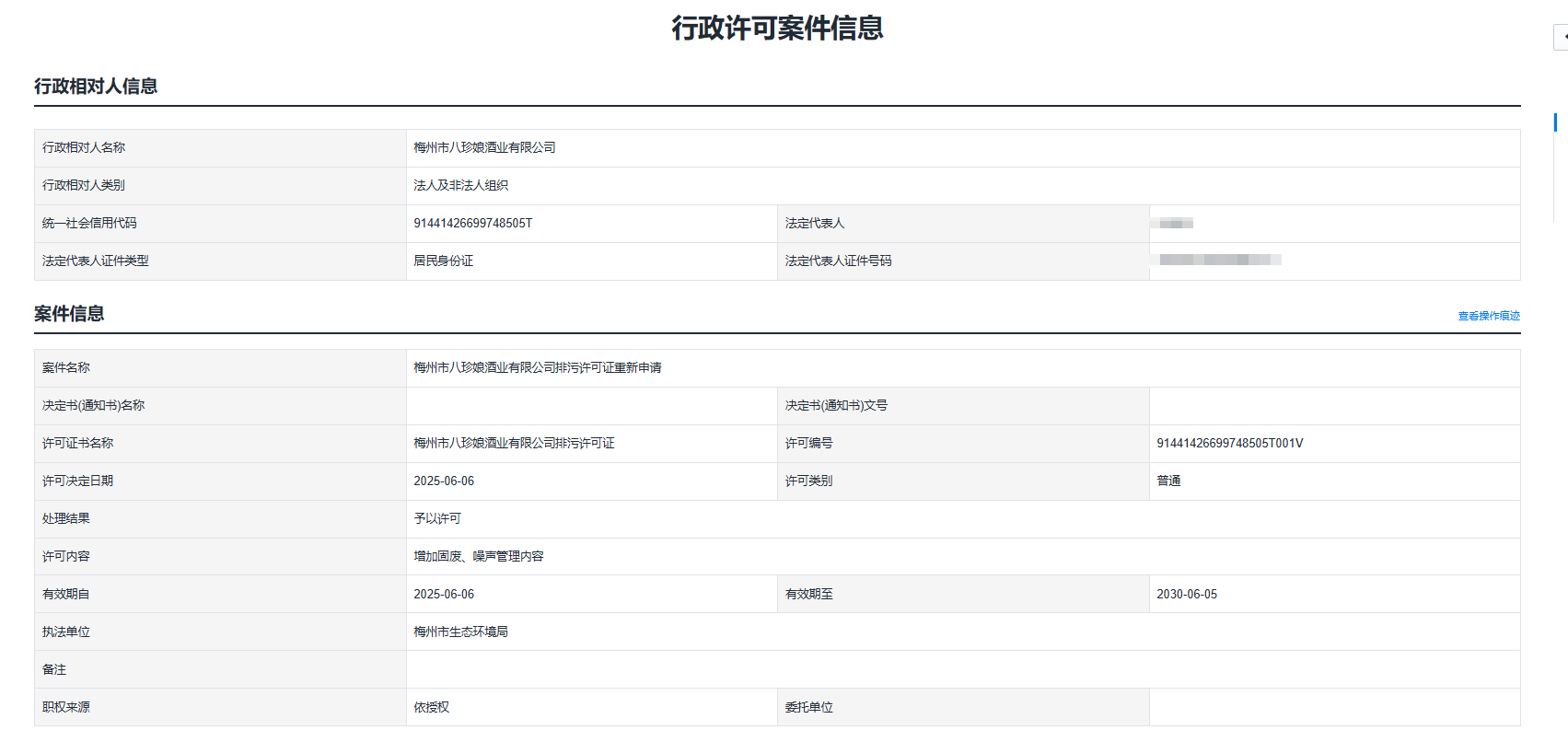 關(guān)于梅州市八珍娘酒業(yè)有限公司排污許可證重新申請的辦結(jié)公告