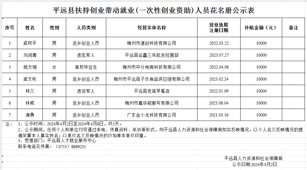 平遠(yuǎn)縣扶持創(chuàng)業(yè)帶動(dòng)就業(yè)(一次性創(chuàng)業(yè)資助)人員花名冊(cè)公示表