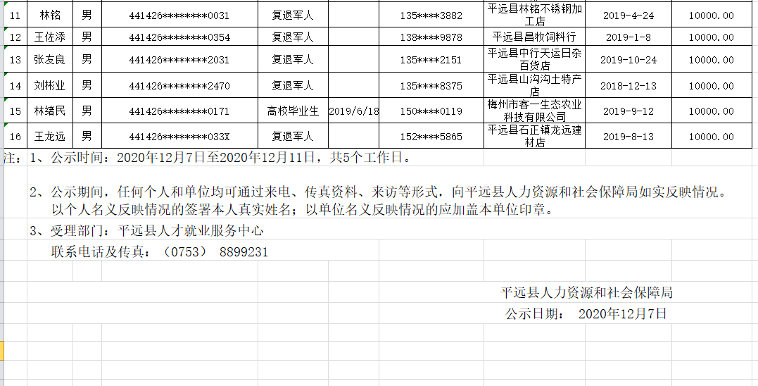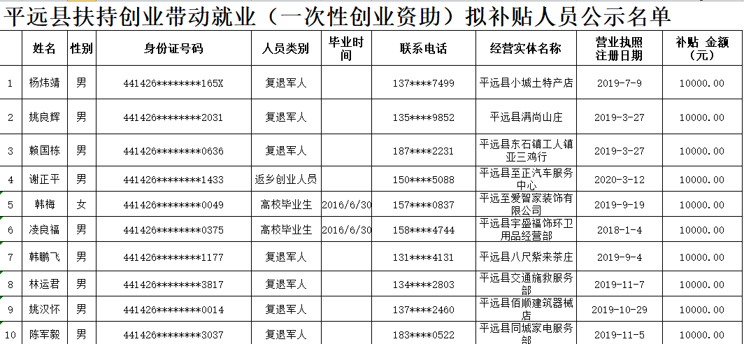 平遠縣扶持創(chuàng)業(yè)帶動就業(yè)(一次性創(chuàng)業(yè)資助)擬補貼人員公示名單
