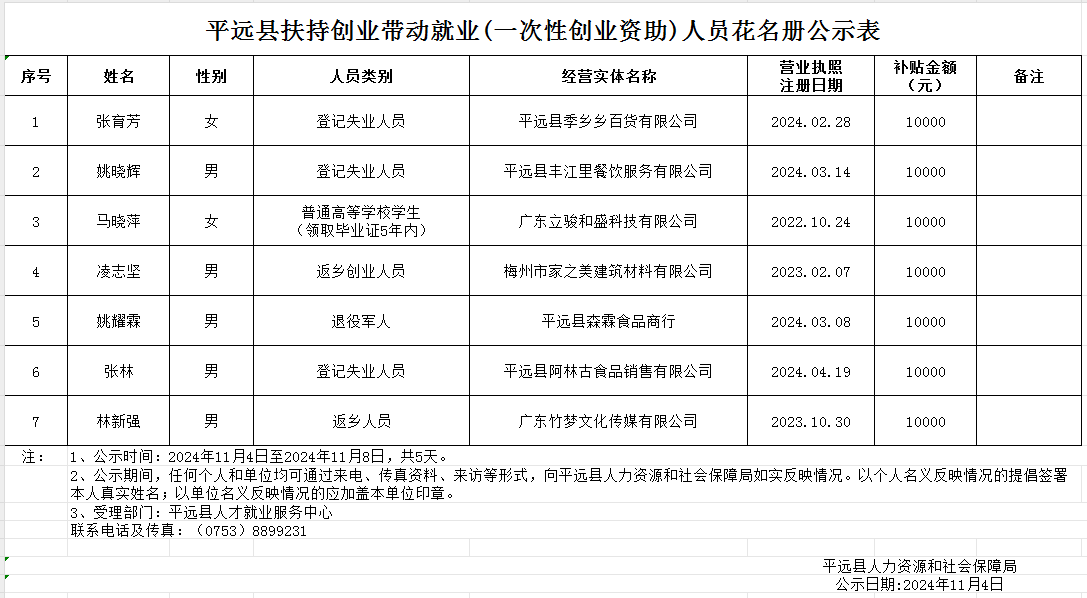平遠縣扶持創(chuàng)業(yè)帶動就業(yè)(一次性創(chuàng)業(yè)資助)人員花名冊公示表