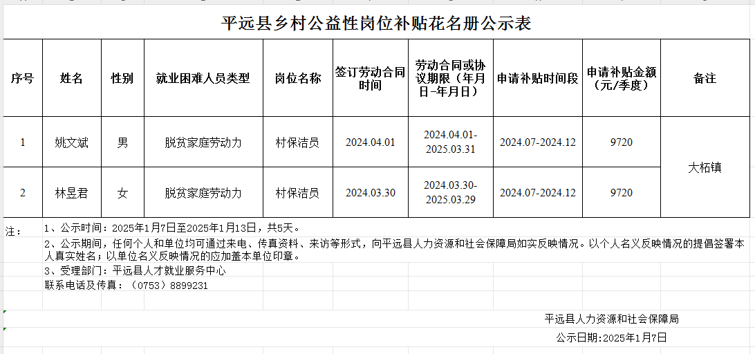 平遠(yuǎn)縣鄉(xiāng)村公益性崗位補貼花名冊公示表