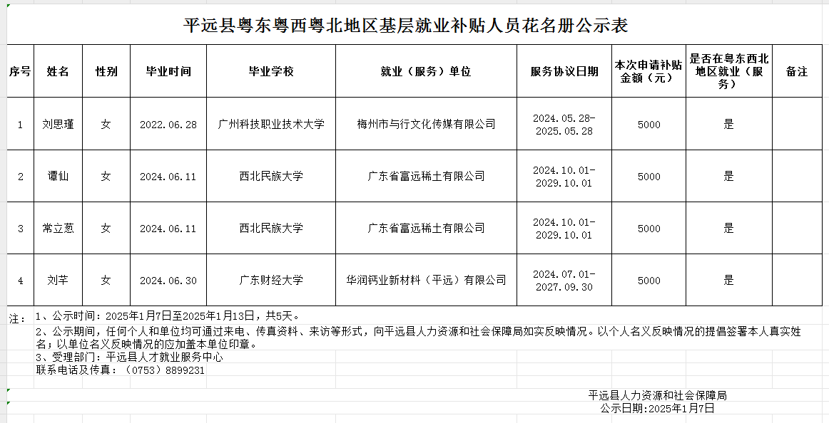 平遠縣粵東粵西粵北地區(qū)基層就業(yè)補貼人員花名冊公示表
