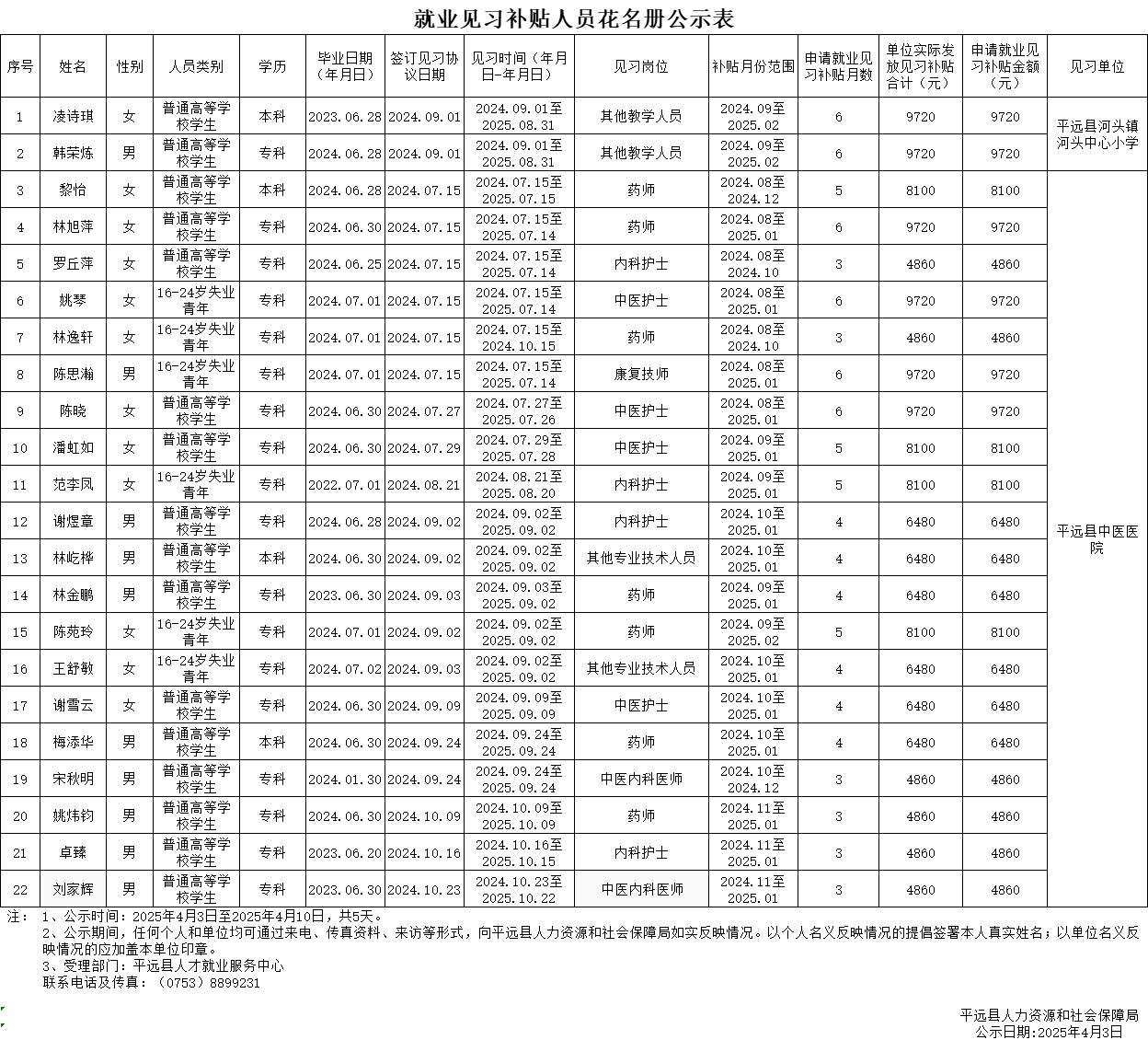 就業(yè)見習(xí)補(bǔ)貼人員花名冊(cè)公示表