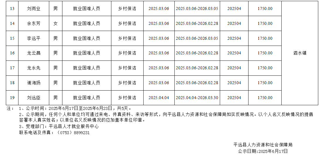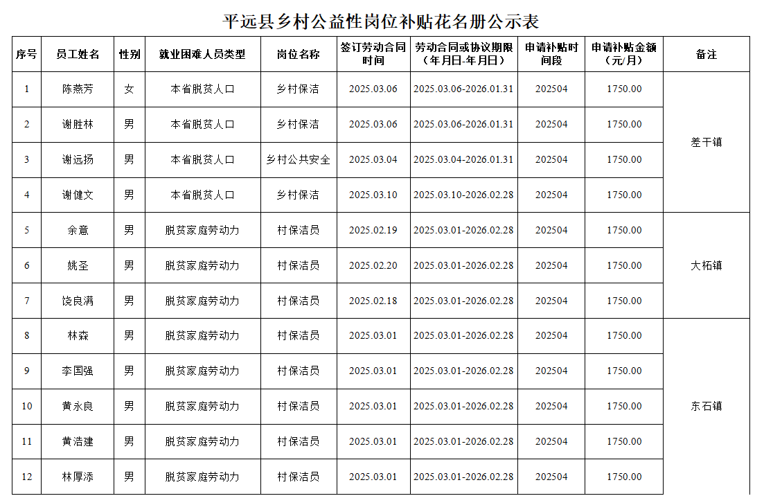平遠縣鄉(xiāng)村公益性崗位補貼花名冊公示表