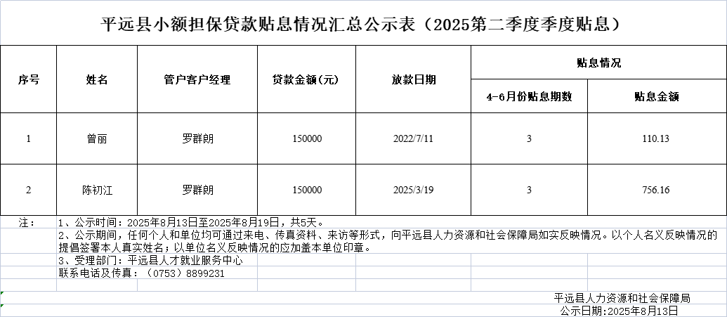 平遠(yuǎn)縣小額擔(dān)保貸款貼息情況匯總表(2025第二季度季度貼息)公示表