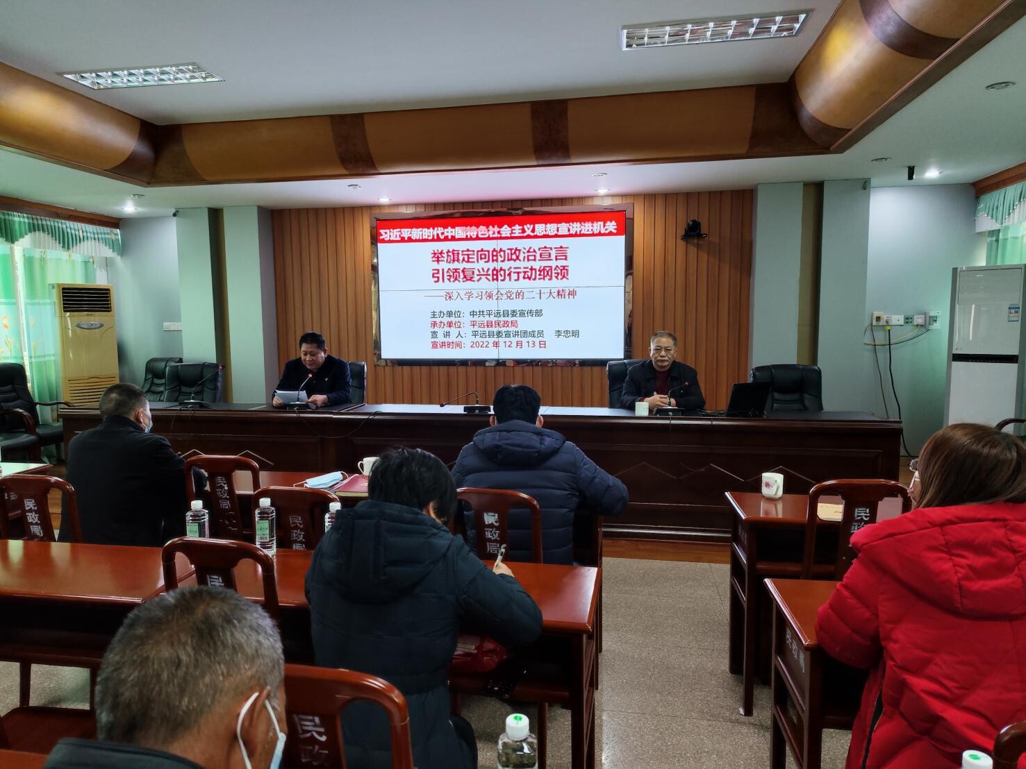 為深入學(xué)習(xí)宣傳貫徹黨的二十大精神,引導(dǎo)全縣民政系統(tǒng)黨員干部和群眾把思想和行動統(tǒng)一到黨的二十大精神上來,把力量凝聚到黨的二十大確定的各項任務(wù)上來,根據(jù)《中共平遠(yuǎn)縣委辦公室關(guān)于做好學(xué)習(xí)貫徹黨的二十大精神宣講工作的通知》要求,12月13日下午,平遠(yuǎn)縣民政局組織召開學(xué)習(xí)宣傳貫徹黨的二十大精神專題宣講報告會。邀請縣委宣講團成員、縣委黨校副校長、一級主任科員李忠明同志作專題輔導(dǎo)報告。會議由局黨組書記、局長顏德華同志主持,局機關(guān)中層以上干部、下屬各單位負(fù)責(zé)人和民政局黨支部、殯儀館黨支部全體黨員以及社會組織黨委全體支部書記共60多人參加了宣講會。 宣講會上,李忠明同志以《舉旗定向的政治宣言