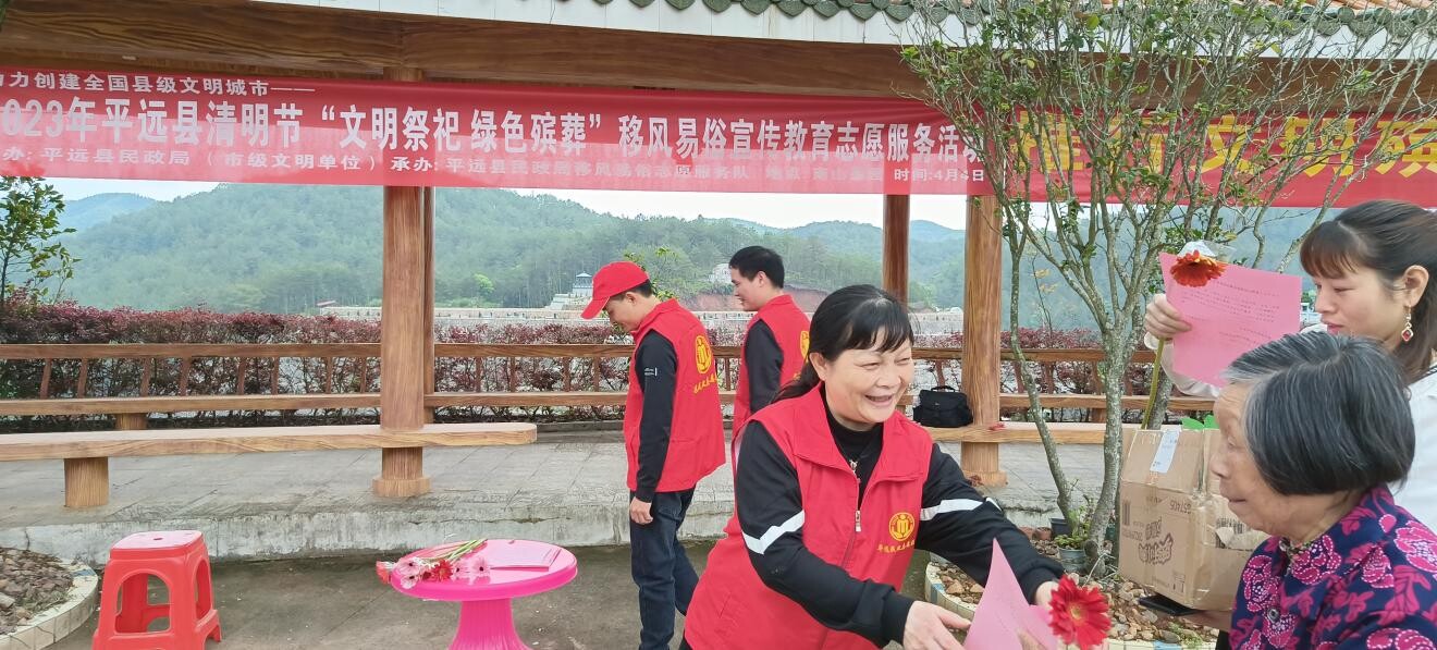 綠色殯葬”為主題的移風(fēng)易俗宣傳教育志愿服務(wù)活動(dòng)。 活動(dòng)中,志愿者積極向前來祭掃的廣大市民朋友發(fā)放鮮花和文明祭祀倡議書,耐心勸導(dǎo)群眾摒棄焚燒紙錢,燃放鞭炮和鋪張浪費(fèi)的祭拜陋俗,大力提倡以鮮花祭奠、植樹祭奠、網(wǎng)絡(luò)祭奠等綠色、文明、安全、健康的現(xiàn)代方式,寄托對逝者的哀思。 據(jù)統(tǒng)計(jì),活動(dòng)現(xiàn)場發(fā)放《清明節(jié)文明祭祀倡議書》共300余份,并向前來祭祀的群眾無償贈(zèng)送鮮花200多支。此次宣傳活動(dòng)有力帶動(dòng)廣大群眾樹立文明殯葬理念,革除陳規(guī)陋習(xí),弘揚(yáng)新風(fēng)正氣,營造了“文明祭掃,平安清明”的良好氛圍,進(jìn)一步提高我縣城市文明程度和市民素質(zhì),積極助力文明城市創(chuàng)建工作。