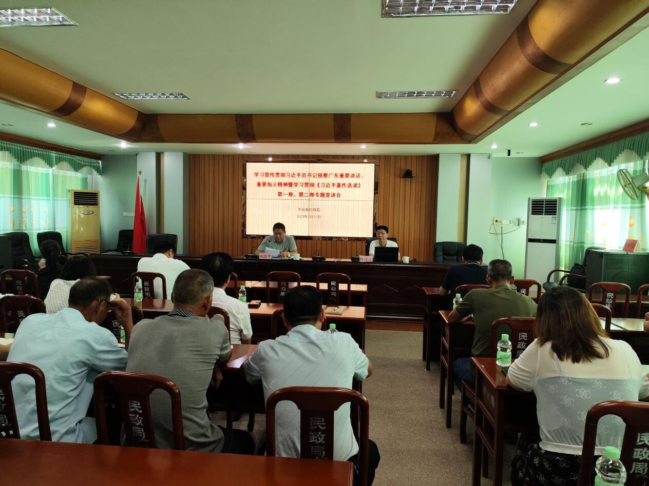 根據(jù)縣委宣傳部《關(guān)于開展學(xué)習(xí)貫徹習(xí)近平總書記視察廣東重要講話重要指示精神宣講工作的通知》《關(guān)于組織開展學(xué)習(xí)貫徹<習(xí)近平著作選讀>第一卷、第二卷宣講工作的通知》精神和局黨組有關(guān)工作安排,7月11日上午,全縣民政系統(tǒng)和社會(huì)組織黨委學(xué)習(xí)貫徹習(xí)近平總書記視察廣東重要講話重要指示精神暨學(xué)習(xí)貫徹《習(xí)近平著作選讀》第一卷、第二卷專題宣講報(bào)告會(huì)在民政局四樓會(huì)議室召開。 會(huì)上,縣委宣講團(tuán)成員、東石鎮(zhèn)四級(jí)調(diào)研員陳瑞金同志分別作了題為《努力續(xù)寫更多“春天的故事”》《認(rèn)真學(xué)好<習(xí)近平著作選讀>,汲取奮進(jìn)前行的強(qiáng)大力量》的專題宣講,民政局黨組書記、局長顏德華同志主持會(huì)議并講話,局機(jī)關(guān)全體干部職工、下屬單位負(fù)責(zé)人和民政局黨支部、殯儀館黨支部、民政局退休黨支部全體黨員以及社會(huì)組織黨委全體支部書記共70多人參加了會(huì)議。 陳瑞金同志從習(xí)近平總書記視察廣東的主要行程和重要講話、重要指示,深刻認(rèn)識(shí)習(xí)近平總書記視察廣東的重大意義,深刻領(lǐng)會(huì)習(xí)近平總書記視察廣東重要講話、重要指示的精神實(shí)質(zhì)和豐富內(nèi)涵,結(jié)合實(shí)際深入貫徹落實(shí)總書記重要講話、重要指示精神和深刻把握《習(xí)近平著作選讀》的豐富內(nèi)涵和精神實(shí)質(zhì)等方面,深刻解讀了習(xí)近平總書記視察廣東重要講話重要指示和《習(xí)近平著作選讀》主要內(nèi)容,是一次圍繞主題、重點(diǎn)突出、聯(lián)系實(shí)際的報(bào)告會(huì),對(duì)全縣民政系統(tǒng)黨員干部學(xué)深悟透總書記重要講話精神具有很好的指導(dǎo)和啟迪作用。 顏德華同志強(qiáng)調(diào),學(xué)習(xí)宣傳貫徹習(xí)近平總書記視察廣東重要講話、重要指示精神,是當(dāng)前和今后一個(gè)時(shí)期的頭等大事和首要政治任務(wù),民政系統(tǒng)全體黨員干部要按照省委、市委、縣委的統(tǒng)一部署,深刻學(xué)習(xí)領(lǐng)會(huì)總書記重要講話的重大意義、精神實(shí)質(zhì)、豐富內(nèi)涵和實(shí)踐要求,把學(xué)習(xí)貫徹習(xí)近平總書記視察廣東重要講話重要指示精神與學(xué)習(xí)《習(xí)近平著作選讀》第一卷、第二卷結(jié)合起來,與貫徹落實(shí)黨的二十大精神結(jié)合起來,與學(xué)習(xí)貫徹習(xí)近平新時(shí)代中國特色社會(huì)主義思想主題教育結(jié)合起來,做到一體學(xué)習(xí)領(lǐng)會(huì)、整體貫徹落實(shí),不折不扣把習(xí)近平總書記的重要講話精神轉(zhuǎn)化為加快平遠(yuǎn)民政事業(yè)高質(zhì)量發(fā)展的信心與決心,落實(shí)落細(xì)到高質(zhì)量發(fā)展過程的方方面面,全力推動(dòng)民政事業(yè)再上新臺(tái)階。